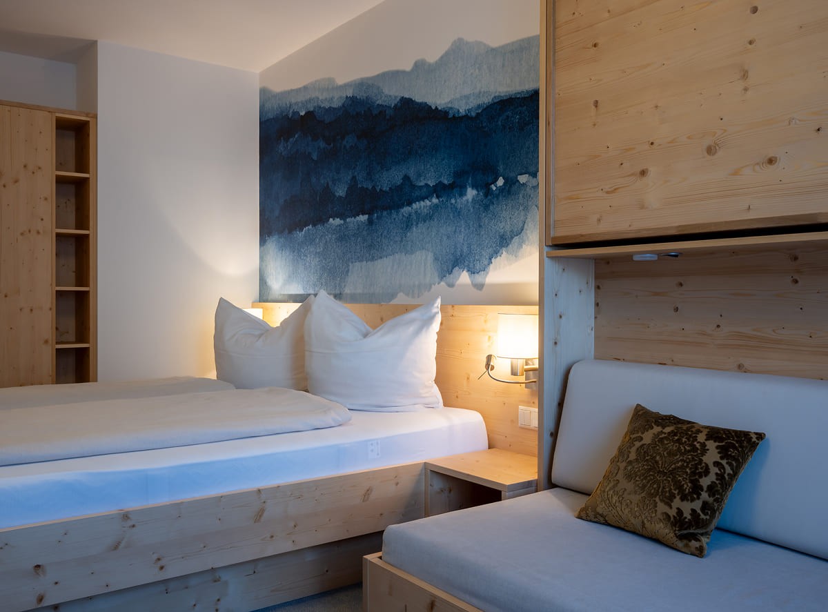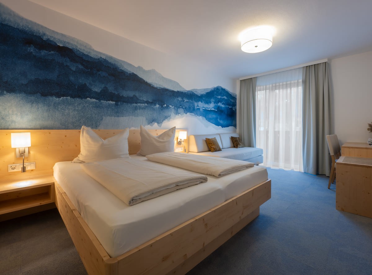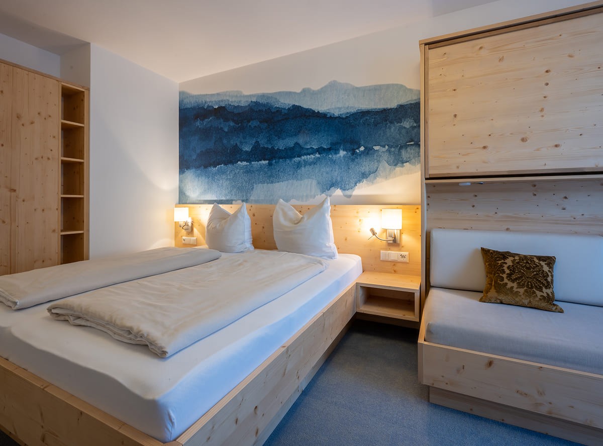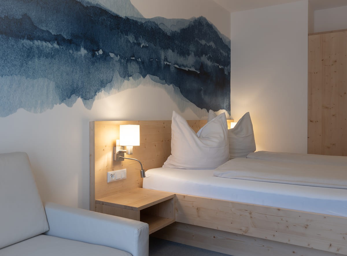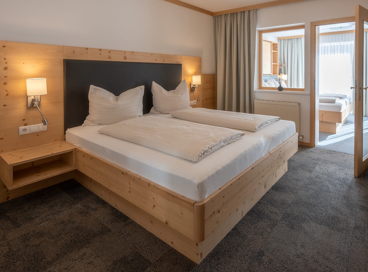 Our freshly renovated double rooms are ideal for couples or small families. If you desire a bit more space, we recommend our family rooms with two separate sleeping areas, some even with two bathrooms – perfect for a vacation with multiple children or friends. Warm colors, natural wood, and a comfortable furnishings create a cozy atmosphere where you will feel at home from the very first moment and recharge after an eventful day.