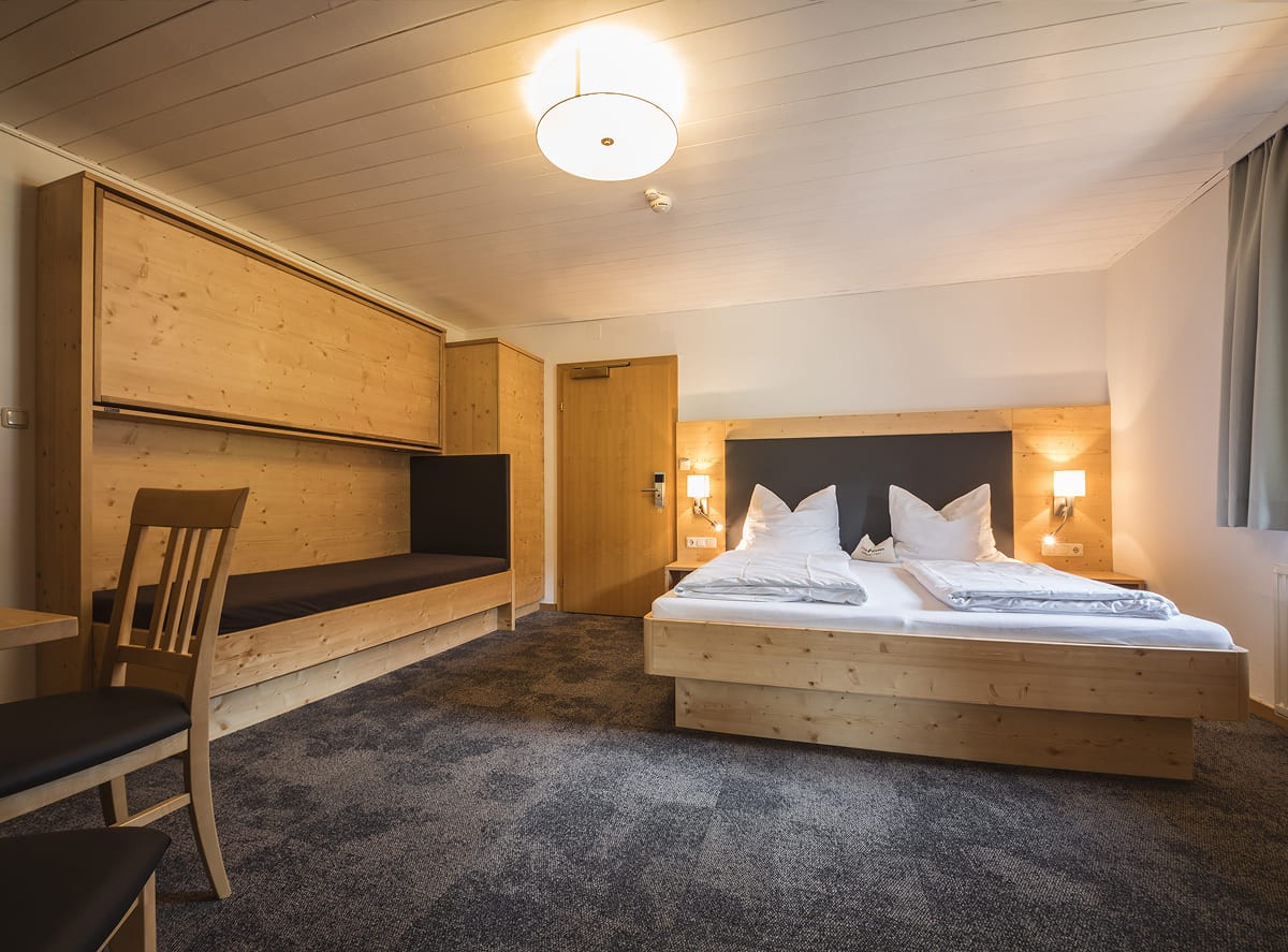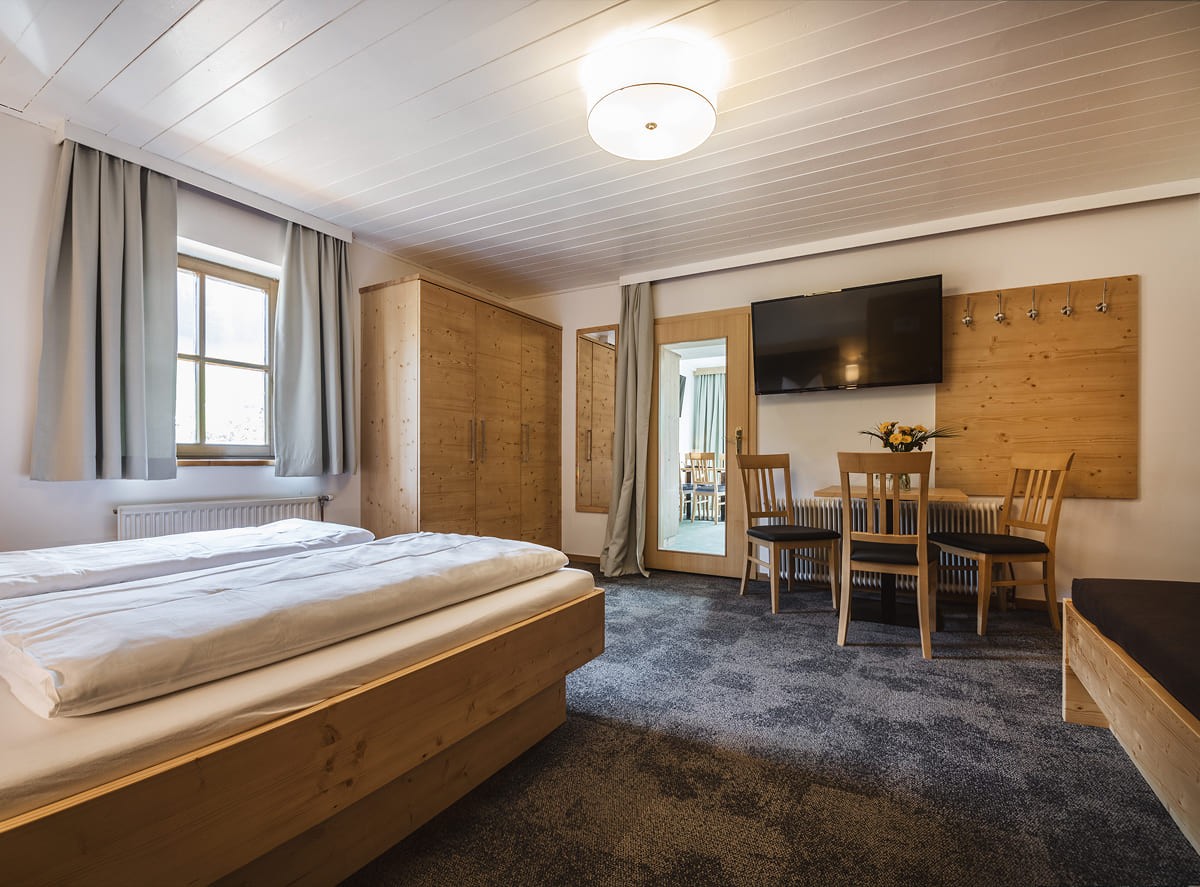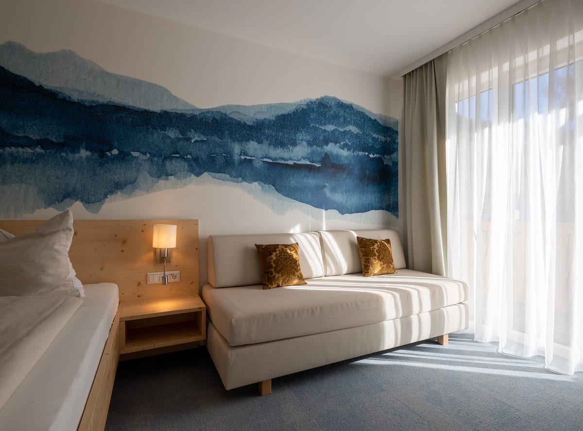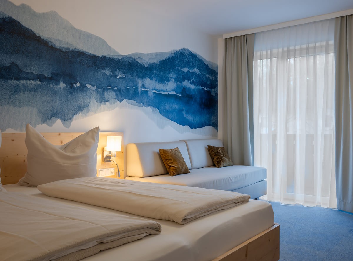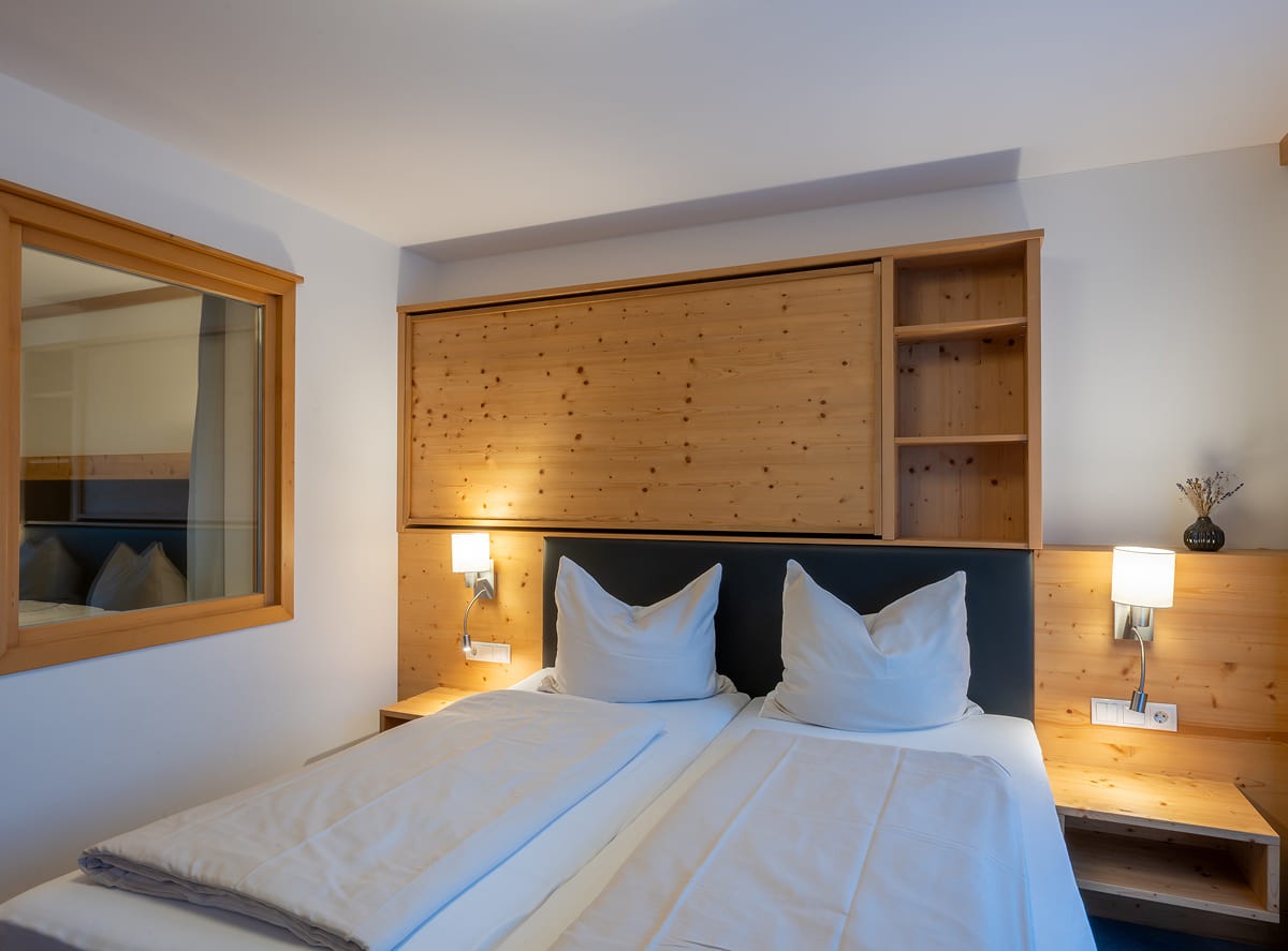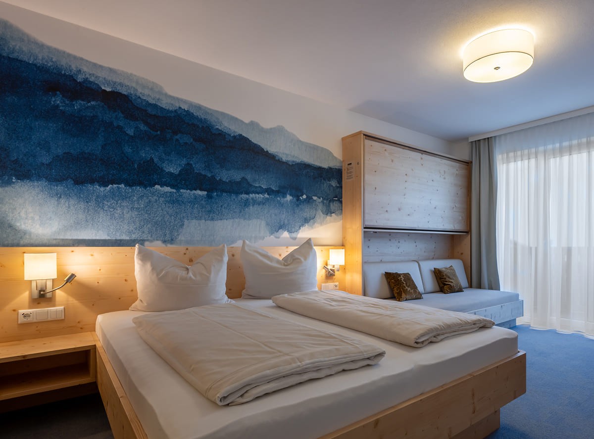 Our freshly renovated double rooms are ideal for couples or small families. If you desire a bit more space, we recommend our family rooms with two separate sleeping areas, some even with two bathrooms – perfect for a vacation with multiple children or friends. Warm colors, natural wood, and a comfortable furnishings create a cozy atmosphere where you will feel at home from the very first moment and recharge after an eventful day.
